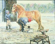 "Winter Shoeing" by Mary Iselin, Mrs. Iselin specializes in equine art in oils, including farm scenes, farriery, portraits and competitive events. She also paints custom portraits of equines for horse owners.