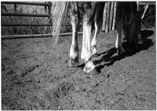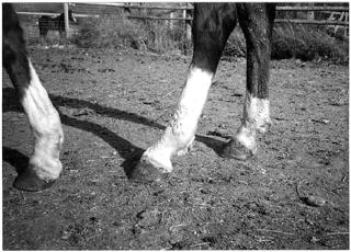 Note: Images with captions are included at the end of this article. "Scratches" is a term that refers to a skin problem on the lower legs of horses, caused by a fungus (and sometimes complicated by bacteria). The affected area becomes crusted, scabby and thickened, creating bumps and sometimes open sores. In severe cases the affected skin may ooze or the whole lower leg may swell, and the horse may become lame. This skin condition generally affects unpigmented skin (the areas of white leg markings) more readily than dark skin, since the unpigmented skin is not as tough-and more apt to chaff and scrape, opening the way for infection. Scratches is a dermatitis, or inflammation of the skin, and the most common cause seems to be the fungus Sporotrichum schenki. Some horses seem to be more susceptible than others, just as some seem more vulnerable to other fungal infections such as ringworm and girth itch. The fungus lives in organic matter and enters through breaks in the skin when the horse walks through contaminated pastures or muddy, swampy areas. The dermatitis that results is basically an inflammation of the deeper layers of the skin, sometimes involving the blood and lymph vessels. The most common site of inflammation is the pastern and fetlock area, often in the heel and back of the pastern where the foot bends. The involved skin becomes warmer, reddish and thickened. Then the skin surface becomes scabby and cracked, and if the condition is not treated it usually becomes badly cracked and oozing and spreads to include larger areas. Infection may also spread to the inner tissues and is sometimes complicated by bacterial infection as well. The thickened skin may come off, leaving bare spots covered with rough skin, or raw areas. Traditional treatments for scratches were astringents like methylene blue, iodine mixed with glycerine, or ointments made with zinc oxide, nitrofurazone and steroids. But a better treatment, recommended by several veterinarians, is a mix of nitrofurazone, DMSO and thiabendazole (a cattle wormer that is also a good fungicide). Thiabendazole cattle wormer paste is hard to find anymore, however (no longer being sold by most veterinarians or mail order livestock supplies because newer drugs have become more popular), so the horsemen can substitute any of the other benzimidazole dewormer drugs, found in horse paste wormers. Some of these are fenbendazole (marketed as Safe-Guard or Panacur), cambendazole, oxybendazole (marketed as Anthelcide EQ), oxfendizole (trade name Benzelmin) and mebendazole. The area on the horse's leg to be treated should first be scrubbed thoroughly to remove all dirt, then the mixture can be applied to the affected part of the leg. The mix should be one part nitrofurazone ointment (an antibiotic salve), one part dewormer paste containing thiabendazole or any of the other benizmidazoles, and one part DMSO. These ingredients can be obtained from a veterinarian. The DMSO (dimethyl sulfoxide) helps reduce swelling and inflammation, and also helps the fungicide (the wormer paste's active ingredient) penetrate the area deeply and thoroughly, taking the medication into the underlying tissues. The nitrofurazone combats any bacterial infection that may accompany the condition, and it helps buffer the DMSO so it won't burn or irritate the tissues. The wormer paste kills the fungus. The dewormer is the safest type of fungicide to use in conjunction with DMSO, according to our veterinarian, since it is an oral medication, safe to use internally in the body. Harsh or poisonous fungicides like iodine should never be used with DMSO because the DMSO carries the medication into the body and could cause serious problems. The affected area should be well cleaned before applying the medication, so no dirt or outside contaminants are carried into the deeper tissues by the DMSO. Warm water is usually adequate for washing the leg, and a handy way to apply it is with a well-rinsed dishwashing detergent squeeze bottle, using your fingers to remove any dirt that is clinging to the leg from the ointment applied at the last doctoring session. After the area is washed with warm water and is very clean, it should be dried it with a towel. The skin should not be wet when the mixture is applied. A mix can be made that will be enough for several doctorings, or it can be mixed up fresh each time-just the amount needed for one application. It can be easily stirred up with a finger, in a small wide-mouth jar. If a person doesn't want skin contact with the DMSO, rubber gloves can be used to mix it and to apply it to the leg. Mixed with nitrofurazone ointment, the DMSO doesn't burn or irritate the skin or raw tissues like it can when used by itself, but a person may still "taste" it if your skin comes into contact with it. If using bare fingers to mix or apply the medication, hands should be washed immediately afterward. If applied daily, this mixture usually clears up scratches faster than traditional treatments. Bandaging, even in severe cases, is unnecessary, and can actually be detrimental to fast healing. The moisture should not be held in. With this treatment a bad case of scratches can be cleared up even if the horse must be ridden and continues to get the area wet and dirty when traveling through mud or on a dusty trail. The leg should be washed and medicated each day after the ride. For a really resistant case that has bacterial complications, you can also give the horse oral sulfa tablets to help combat the bacterial infection, and dexamethasone to aid in reducing the swelling and inflammation, according to our veterinarian.