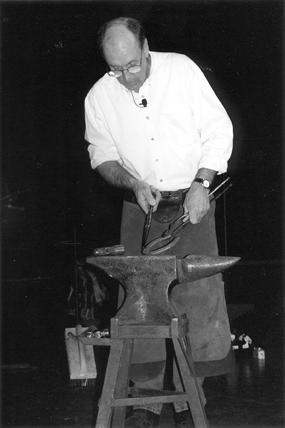 Image: Bruce Daniels at shoeing demonstration "Why is there so much emphasis on the lectures, the science, at the Convention?" came the question at the American Farriers general membership meeting. "We want to see more good, old-fashioned horseshoeing at the event." This year's convention strove to showcase more old-fashioned horseshoeing by offering a live demonstration by Myron McLane and Bruce Daniels in the exhibition hall Saturday afternoon. Hopefully, the tradition will continue, and that more of our most beloved and respected professionals will be given the chance to impart the insights of their hard-earned years of experience. For many of us these demonstrations are part of our apprenticeship, and one of the reasons we attend AFA events. After all, the AFA is just a bunch of us: American farriers, East Coast to West, and everything in between, including Alaska, Hawaii and all the international folks, as well, all associating and interacting with each other. Associate: To connect, combine, join; to join as a companion, partner, colleague, friend; united or related by the same interests, purposes (from Webster's Dictionary). This means we share something in common with one another, like the elation of getting the job done, the frustration of working with a sour horse, and the exhaustion of a sore back and tired bones at the end of a long day. It is also sharing joy when things go right and anger when things go wrong.