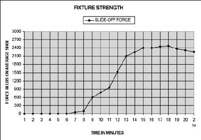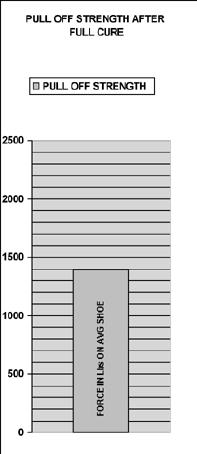 Editors Note: Tom Gauthier is a researcher for Equilox. Tom is a retired engineer and has worked with hoof adhesives since 1989. He has studied the manufacturing, packaging and development of Equilox adhesives and is currently assisting Equilox in its search for new products. Additional Note: Data graphs appear at the end of this article How do you know an adhesive works? How do you know which one is the best? How do you know if an adhesive will work for your specific application? These questions have plagued us since we started using adhesives for hoof repair. We can look for answers in the standard tests used in the adhesive industry, but we find those standard tests measure properties that we do not care about and don't measure those that we do. We can put samples out to farriers for "field testing" and the responses usually come back: 1) "It works very well" or 2) "It doesn't work at all"-and usually these responses are split 50/50! With the changes coming in the adhesive field, we are forced to look at adhesives other than the "old standards" and we need to look at performance differences, objectively, in this evaluation. Equilox recently put out samples of "EQUILOX PLUS" for evaluation and got back a very split response. While there are differences in different adhesives, all of them are manufactured in closely controlled lots that will not allow major differences in performances within the same type and the same batch. So why the different responses? The answer is in the variables. You know-the air temperature, solvents, contaminants, the moisture or oil in the hoof, the condition of the surface, the mixing of the adhesive, applying within the working time, the application technique, and more. We know we can't avoid these variables in actual use, but if we are on the bad side of one or more of these variables when testing a sample it may result in failure and the appearance of a "bad product." We decided to test our products in a "laboratory" environment to eliminate these possible problems and get a true picture of the adhesive. We know farriers work in the worst conditions and you can't avoid these variables in everyday work, but they are going to be present no matter what adhesive you are using. In our testing, let's take them out of the picture to look truly at the adhesive performance. We decided we needed to test for the two properties you need the most: how well does it stick and how soon can you put the foot down! Understanding that all of these adhesives are exothermic (give off heat), we also measured temperature during the cure. We found that the larger the sample the more heat was given off. To be fair, we selected a sample size of approximately 1 square inch x 1/4-inch thick. This was done by milling a pocket, 1/4-inch deep in a wooden block and placing the thermometer probe at the bottom and center of the pocket. This would simulate the temperature generated at the adhesive/ hoof junction in a thick resection procedure. This did show significantly higher temperatures than we expected, but remember, this measurement was taken in the "worst- case scenario" and does not show reduction from heat dissipation from aluminum shoes, thinner sections, etc. All adhesives were tested in the same manner and readings were recorded over the cure time. To test how a product sticks we had to test bonds between hoof wall and aluminum. Since consistent hoof wall is difficult to obtain and difficult to form to a consistent shape, we searched for another substrate with similar properties that would be easier to test. Our preliminary tests on wood showed clean, dry oak was similar in strength, structure and bonding ability to clean, dry hoof wall. Both materials fractured in the substrate when testing fully cured adhesive, indicating the cured adhesive was stronger than the material. Fine-grain oak was much easier to get! To test when you could put the foot down we needed to know the strength of the bond, the compressive strength of the adhesive and the durometer hardness at different times during the adhesive cure. It was easy to measure the hardness during the cure time, but to get a profile of the adhesive strength we had to make our own test. Using clean, dry oak, we fabricated a test block to fit in a measuring fixture. On that test block we cut a shape similar to the cross-sectional profile you would see at the junction of the hoof wall and shoe. We then made an aluminum block 1/4-inch thick of 1/2 square-inch surface and bonded that over the profile cut in the block. The test measured the force required to "push" the aluminum block off the wood block with forces applied parallel to the surface. We found that progressively more force was required as time elapsed and that after 75-80% of the cure was complete, the wood block would fracture, indicating maximum strength. To test for compressive strength we made a temporary mold that would mold blocks of adhesive 1/4-inch thick and approximately 1" in diameter. The mold was constructed of silicone rubber so when placed on a metal backing strip, we could "mold a series of four individual samples and remove the mold as the adhesive set. At different times in the curing cycle, pressure was applied with a press through a ram of specific area and the force on the ram measured until the specimen failed. Failure condition was defined as compression of the sample to 50% of its original thickness. The force required to reach this point was progressively more as the adhesive cured. As a final test we created a "lap shear" sample by bonding two small pieces of aluminum with 1/2 inch square of bonded surface. After the adhesive had fully cured (24 hours), the samples were pulled apart and the force was measured. This does not measure the force to remove a shoe from the horse because we are not considering the adhesive to hoof bond. It does, however, give a relative number that we are able to compare the ultimate bond strength to aluminum of all adh
