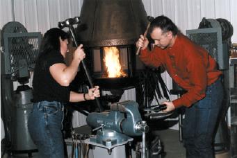 | Katherine and Jim Poor, farriers from Midland, TX, combine efforts to create a copper horseshoe while visiting the museum |