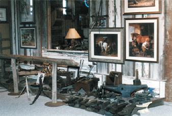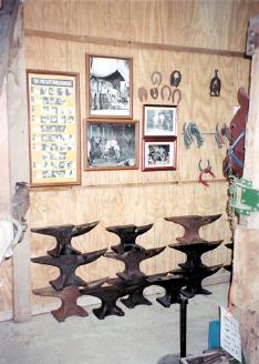 | Some of the beautiful farrier artwork and other equipment Note the old forge in the background |