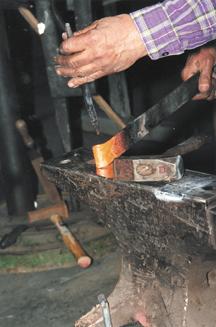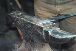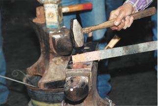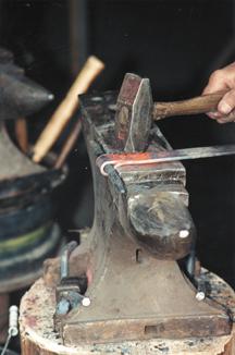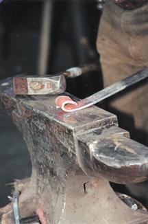 | 8. The smith lowers the holding hand as he/she "traps" the mandrel with half-face (overhanging) blows. The scarf is up; the loop hangs down. This is a good setup for welding. The hammer is an old three pound Channellock. |