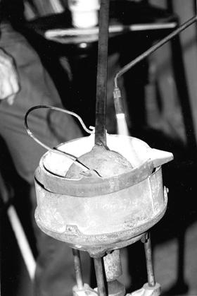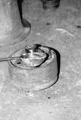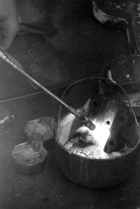 | 6. The babbitt material is melted in the cupola. Beeswax is used as a flux to mix old and new babbitt. Do not overheat babbitt. |