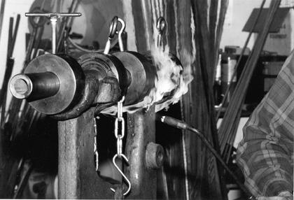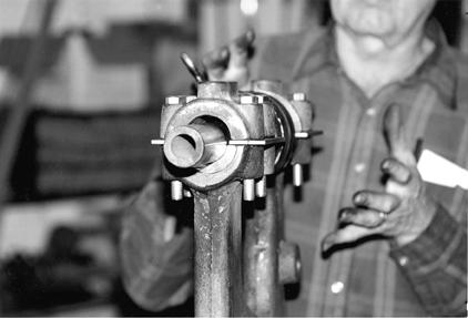 | 5. Before pouring the babbitt it is necessary to preheat in order to drive all the moisture out and to allow babbitt to flow for a smoother bearing. In this case, the frame and mandrel should be preheated to approximately 360 degrees F. Note the use of a tie-down to hold the shaft in place above the frame. |