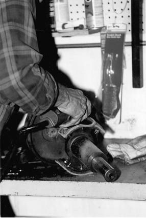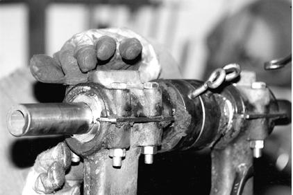 | 16. The journals are put into place to check end play. Shaft assembly shows old clutch material. |