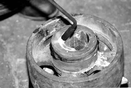 | 21. The clutch assembly is prepared to accept new babbitt material. The old babbitt material is melted out. As you can see from the photograph, some brazing was necessary on the wheel. The hose clamp holds Babbitt-Rite to plug a hole in bottom of the clutch collar groove. |