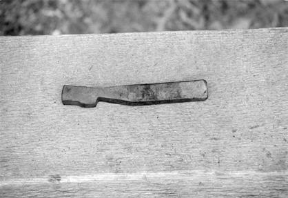 | 2.& 3. Put the barstock over the opposite edge of the anvil, extending it about 1 1/2" over the edge and forge it down, with half-face blows as well. |