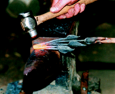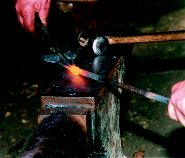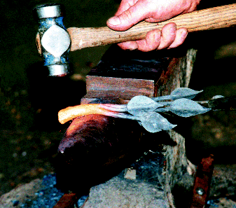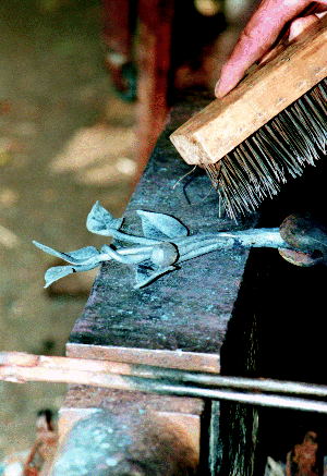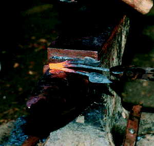 | 2. If I have a good clean fire, I don’t need to use flux. If I do use sand, I keep it off the face side of the weld. It’s mainly there to provide protection from the oxygen blast from the fire. The American fires with the center blast are particularly bad for that. If you’ve got a side blast, you can come away from your blast somewhat and protect it shield your work piece. | ![]() |