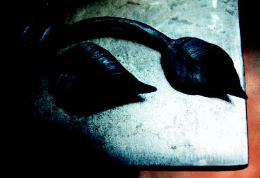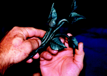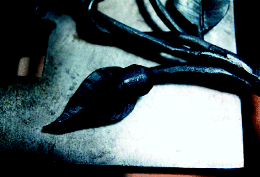 | 12. So I put it in the vise to try to achieve that objective. I twist the leaves with two pairs of tongs, again, to give it a more authentic look. Nature doesn’t have too many straight or square edges. |