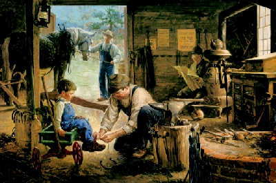own wagon. The blacksmith, noticing that the boy's shoe is untied, shows