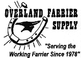 Overland Farrier Supplies 4990 NE O,Neil Way Redmond, OR 97756 Phone: 541/548-5277 Phone: 800/838-5277 Fax: 541/548-5277 Contact: Sharon Miller Complete line of farrier supplies