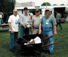 On May 19, 2001, at the Carroll County Farm Museum's Blacksmith Days, history was made. A team of farriers challenged a team of blacksmiths to an anvil relay race. The farriers were quite surprised by the blacksmith's initial apprehension to partake. But they rose to the challenge when a case of Guinness beer was thrown in with the trophy for the winners. From the opening start the blacksmiths took a commanding lead which they never surrendered. We never would have guessed that guys who look like that could run so fast. Yes, gentlemen, our hats are off to you and congratulations! You may have won the race, took sole possession of the Gibbins/Kearns Cup, have all bragging rights for the whole year, and the case of Guinness to enjoy, but just remember, farriers still drive nicer trucks. So live with that and we'll see you next year.