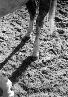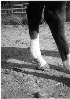 Note: Images with captions are included at the end of this article. "Scratches" is a term that refers to a skin problem on the lower legs of horses, caused by a fungus (and sometimes complicated by bacteria). The affected area becomes crusted, scabby and thickened, creating bumps and sometimes open sores. In severe cases the affected skin may ooze or the whole lower leg may swell, and the horse may become lame. This skin condition generally affects unpigmented skin (the areas of white leg markings) more readily than dark skin, since the unpigmented skin is not as tough-and more apt to chaff and scrape, opening the way for infection. Scratches is a dermatitis, or inflammation of the skin, and the most common cause seems to be the fungus Sporotrichum schenki. Some horses seem to be more susceptible than others, just as some seem more vulnerable to other fungal infections such as ringworm and girth itch. The fungus lives in organic matter and enters through breaks in the skin when the horse walks through contaminated pastures or muddy, swampy areas. The dermatitis that results is basically an inflammation of the deeper layers of the skin, sometimes involving the blood and lymph vessels. The most common site of inflammation is the pastern and fetlock area, often in the heel and back of the pastern where the foot bends. The involved skin becomes warmer, reddish and thickened. Then the skin surface becomes scabby and cracked, and if the condition is not treated it usually becomes badly cracked and oozing and spreads to include larger areas. Infection may also spread to the inner tissues and is sometimes complicated by bacterial infection as well. The thickened skin may come off, leaving bare spots covered with rough skin, or raw areas. Traditional treatments for scratches were astringents like methylene blue, iodine mixed with glycerine, or ointments made with zinc oxide, nitrofurazone and steroids. But a better treatment, recommended by several veterinarians, is a mix of nitrofurazone, DMSO and thiabendazole (a cattle wormer that is also a good fungicide). Thiabendazole cattle wormer paste is hard to find anymore, however (no longer being sold by most veterinarians or mail order livestock supplies because newer drugs have become more popular), so the horsemen can substitute any of the other benzimidazole dewormer drugs, found in horse paste wormers. Some of these are fenbendazole (marketed as Safe-Guard or Panacur), cambendazole, oxybendazole (marketed as Anthelcide EQ), oxfendizole (trade name Benzelmin) and mebendazole. The area on the horse's leg to be treated should first be scrubbed thoroughly to remove all dirt, then the mixture can be applied to the affected part of the leg. The mix should be one part nitrofurazone ointment (an antibiotic salve), one part dewormer paste containing thiabendazole or any of the other benizmidazoles, and one part DMSO. These ingredients can be obtained from a veterinarian. The DMSO (dimethyl sulfoxide) helps reduce swelling and inflammation, and also helps the fungicide (the wormer paste's active ingredient) penetrate the area deeply and thoroughly, taking the medication into the underlying tissues. The nitrofurazone combats any bacterial infection that may accompany the condition, and it helps buffer the DMSO so it won't burn or irritate the tissues. The wormer paste kills the fungus. The dewormer is the safest type of fungicide to use in conjunction with DMSO, according to our veterinarian, since it is an oral medication, safe to use internally in the body. Harsh or poisonous fungicides like iodine should never be used with DMSO because the DMSO carries the medication into the body and could cause serious problems. The affected area should be well cleaned before applying the medication, so no dirt or outside contaminants are carried into the deeper tissues by the DMSO. Warm water is usually adequate for washing the leg, and a handy way to apply it is with a well-rinsed dishwashing detergent squeeze bottle, using your fingers to remove any dirt that is clinging to the leg from the ointment applied at the last doctoring session. After the area is washed with warm water and is very clean, it should be dried it with a towel. The skin should not be wet when the mixture is applied. A mix can be made that will be enough for several doctorings, or it can be mixed up fresh each time-just the amount needed for one application. It can be easily stirred up with a finger, in a small wide-mouth jar. If a person doesn't want skin contact with the DMSO, rubber gloves can be used to mix it and to apply it to the leg. Mixed with nitrofurazone ointment, the DMSO doesn't burn or irritate the skin or raw tissues like it can when used by itself, but a person may still "taste" it if your skin comes into contact with it. If using bare fingers to mix or apply the medication, hands should be washed immediately afterward. If applied daily, this mixture usually clears up scratches faster than traditional treatments. Bandaging, even in severe cases, is unnecessary, and can actually be detrimental to fast healing. The moisture should not be held in. With this treatment a bad case of scratches can be cleared up even if the horse must be ridden and continues to get the area wet and dirty when traveling through mud or on a dusty trail. The leg should be washed and medicated each day after the ride. For a really resistant case that has bacterial complications, you can also give the horse oral sulfa tablets to help combat the bacterial infection, and dexamethasone to aid in reducing the swelling and inflammation, according to our veterinarian.