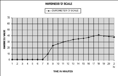 Editors Note: Tom Gauthier is a researcher for Equilox. Tom is a retired engineer and has worked with hoof adhesives since 1989. He has studied the manufacturing, packaging and development of Equilox adhesives and is currently assisting Equilox in its search for new products. Additional Note: Data graphs appear at the end of this article How do you know an adhesive works? How do you know which one is the best? How do you know if an adhesive will work for your specific application? These questions have plagued us since we started using adhesives for hoof repair. We can look for answers in the standard tests used in the adhesive industry, but we find those standard tests measure properties that we do not care about and don't measure those that we do. We can put samples out to farriers for "field testing" and the responses usually come back: 1) "It works very well" or 2) "It doesn't work at all"-and usually these responses are split 50/50! With the changes coming in the adhesive field, we are forced to look at adhesives other than the "old standards" and we need to look at performance differences, objectively, in this evaluation. Equilox recently put out samples of "EQUILOX PLUS" for evaluation and got back a very split response. While there are differences in different adhesives, all of them are manufactured in closely controlled lots that will not allow major differences in performances within the same type and the same batch. So why the different responses? The answer is in the variables. You know-the air temperature, solvents, contaminants, the moisture or oil in the hoof, the condition of the surface, the mixing of the adhesive, applying within the working time, the application technique, and more. We know we can't avoid these variables in actual use, but if we are on the bad side of one or more of these variables when testing a sample it may result in failure and the appearance of a "bad product." We decided to test our products in a "laboratory" environment to eliminate these possible problems and get a true picture of the adhesive. We know farriers work in the worst conditions and you can't avoid these variables in everyday work, but they are going to be present no matter what adhesive you are using. In our testing, let's take them out of the picture to look truly at the adhesive performance. We decided we needed to test for the two properties you need the most: how well does it stick and how soon can you put the foot down! Understanding that all of these adhesives are exothermic (give off heat), we also measured temperature during the cure. We found that the larger the sample the more heat was given off. To be fair, we selected a sample size of approximately 1 square inch x 1/4-inch thick. This was done by milling a pocket, 1/4-inch deep in a wooden block and placing the thermometer probe at the bottom and center of the pocket. This would simulate the temperature generated at the adhesive/ hoof junction in a thick resection procedure. This did show significantly higher temperatures than we expected, but remember, this measurement was taken in the "worst- case scenario" and does not show reduction from heat dissipation from aluminum shoes, thinner sections, etc. All adhesives were tested in the same manner and readings were recorded over the cure time. To test how a product sticks we had to test bonds between hoof wall and aluminum. Since consistent hoof wall is difficult to obtain and difficult to form to a consistent shape, we searched for another substrate with similar properties that would be easier to test. Our preliminary tests on wood showed clean, dry oak was similar in strength, structure and bonding ability to clean, dry hoof wall. Both materials fractured in the substrate when testing fully cured adhesive, indicating the cured adhesive was stronger than the material. Fine-grain oak was much easier to get! To test when you could put the foot down we needed to know the strength of the bond, the compressive strength of the adhesive and the durometer hardness at different times during the adhesive cure. It was easy to measure the hardness during the cure time, but to get a profile of the adhesive strength we had to make our own test. Using clean, dry oak, we fabricated a test block to fit in a measuring fixture. On that test block we cut a shape similar to the cross-sectional profile you would see at the junction of the hoof wall and shoe. We then made an aluminum block 1/4-inch thick of 1/2 square-inch surface and bonded that over the profile cut in the block. The test measured the force required to "push" the aluminum block off the wood block with forces applied parallel to the surface. We found that progressively more force was required as time elapsed and that after 75-80% of the cure was complete, the wood block would fracture, indicating maximum strength. To test for compressive strength we made a temporary mold that would mold blocks of adhesive 1/4-inch thick and approximately 1" in diameter. The mold was constructed of silicone rubber so when placed on a metal backing strip, we could "mold a series of four individual samples and remove the mold as the adhesive set. At different times in the curing cycle, pressure was applied with a press through a ram of specific area and the force on the ram measured until the specimen failed. Failure condition was defined as compression of the sample to 50% of its original thickness. The force required to reach this point was progressively more as the adhesive cured. As a final test we created a "lap shear" sample by bonding two small pieces of aluminum with 1/2 inch square of bonded surface. After the adhesive had fully cured (24 hours), the samples were pulled apart and the force was measured. This does not measure the force to remove a shoe from the horse because we are not considering the adhesive to hoof bond. It does, however, give a relative number that we are able to compare the ultimate bond strength to aluminum of all adh