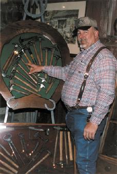 | Lee Liles points to his collection of champion horseshoe hammers, the quest of which led to his collection of tools for horseshoeing |
