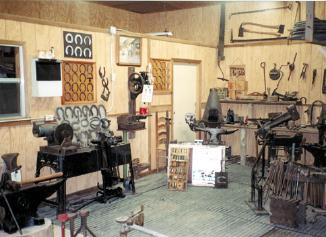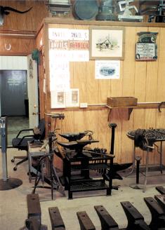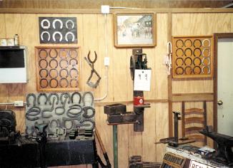 | Some of the beautiful farrier artwork and other equipment Note the old forge in the background |