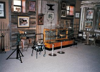 Note: Images and captions are at the end of this article. Everyone owes a part of his time and money to the business and industry in which he is engaged. No man has a moral right to withhold his support from an occupation that is striving to improve conditions. -Theodore Roosevelt Urged by this philosophy, Lee Liles can walk with visitors and explain the importance of treasured artifacts in the National Museum of the Tools of Horse Shoeing and Hall of Honor, which he describes as the largest collection of such tools in the world. It is a walk back into history and a return to the present. Horses and mules contributed a vital part to the development of America, especially in settling the West. The animals played such an important role in the American Civil War that high-ranking Union officers demanded that troops seek and destroy Southern blacksmith shops on which armies at that time depended. Soldiers in blue carried out their mission of destruction. They promoted an end to the conflict when they found and destroyed the tools that kept Confederate troops supplied with the absolute necessity of food and supplies. Complying with the order, invading Union soldiers pounded on the horn until they separated it from the anvil, thereby denying further use. And then they grabbed the much-wanted nails. As important as the blacksmith was in keeping the harness horses and pack mules safely shod, "his craftsmanship was just as vital in keeping the wheels of wagons rolling safely," Liles explained. As pioneers moved westward, one of the first businesses to appear was a hardware store with blacksmith supplies, and next a blacksmith shop. A hotel and restaurant followed, along with a Western saloon and place of entertainment, outbuildings, a livery stable, a courthouse and a jail. Other business establishments were added as the need and demand arose. The visitor finds this idea suggested in a subtle manner in the background in a spacious section of the museum. "Most blacksmiths shod horses and mules as part of their primary work with hammer, anvil, and forge," Liles explained. "Other craftsmen avoided general work of the smithy, became farriers, and limited their work to care of the animals' feet. The two most important needs of the blacksmith and farrier are hammers and anvils," he said. The latter he numbered by the dozens. One of those anvils Lee can boast about as being the largest in the world. He knows, because he designed it and had it cast, "just so I could say this museum has the largest in the world!" He can compare that enormous size to the smallest, which weighs in at 63 pounds. The cost of shipping heavy anvils by wagons was enough to encourage users in many states to design and cast their own version, using local materials if available. By tapping each with a hammer, Liles demonstrates how each anvil responds with its individual ping, ping, ping tone. Variation of sounds is made possible by the different materials and method of casting. The collection in one area of 105 anvils includes 56 designed for the farrier. One display is composed of horseshoeing anvils of less than 40 pounds. The oldest is a Fisher, cast in 1889. An English carriage anvil, which dates back to 1830-40, sports two horns, each shaped for a special need. Variations in the form of the anvil's horn make up another part of the collection, and these also were designed to serve a special need. Years ago Lee learned in competition that other craftsmen who care for the hooves of horses and mules had something he did not have. And when he learned it was a Champion farrier's hammer, he sought one. The search was so exciting he continued, and can show 27 of that favorite of all horseshoe hammers, a collection which he describes as the world's largest. The search proved so thrilling that after Lee found what he wanted, he just kept on looking. "I still thrill when I find something few others have," he said. Throughout the walk through the museum the visitor is aware of the arrangement of tools as the touch of a discriminating artist. The museum also contains two different styles of trip hammers, foot- powered and mechanical. Various sizes of hammers include a 20-pound sledge, one which would have demanded the best even of the village blacksmith who was praised by the poet Henry Wadsworth Longfellow in his well-known and nostalgic poem, "The Village Blacksmith." (See Anvil Magazine, September 2001.) In it he wrote: "And the muscles of his brawny arms are strong as iron bands." To overcome cold iron's resistance to pounding into shape, heat from the burning forge is called upon to make the metal pliable. That means a forge. Air must be forced through burning coal or coke to produce the desired heat that makes metal pliable. The first of the fire enhancers were huge bellows. When handles were pulled together, the device forced air through the forge, spurring the burning coal or coke into action. The simple device served for generations until someone developed the bellows of dual action, providing a constant flow of air. That gave way to the hand-cranked blowers. Today the operation is made efficient with the electrically powered rheostat to supply and control the flow of air to feed the fire. It speeds up the process of preparing the metal. One of the early ones on display is dual action. The bellows on display at the museum served the English smithies eons ago, but has been well preserved. And it was the roar of the bellows that attracted school children to "look in at the open door," in Longfellow's poem. In addition, many forges have been selected for display in the museum. Hundreds of tongs are included, each designed to grasp and hold a particular piece of metal. All are products of the smithy, the forge, the blower, the hammer, and the anvil. Care of the feet of horses and mules which served the cavalry demanded remedial work on extended assignments when away from camp. That meant forges and anvils had to be designed to be tak