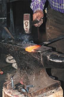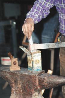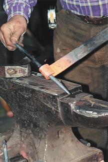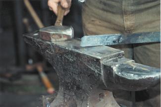 | 8. The smith lowers the holding hand as he/she "traps" the mandrel with half-face (overhanging) blows. The scarf is up; the loop hangs down. This is a good setup for welding. The hammer is an old three pound Channellock. |
