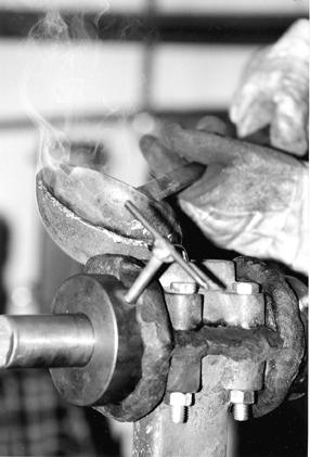 | 11. The jigs are put in place and the babbitt damming material is placed all around as a seal. Once again the top half is preheated with a torch, the babbitt material is once again heated up in the cupola and poured into the chamber, through the oil hole. |