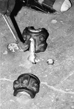 | 21. The clutch assembly is prepared to accept new babbitt material. The old babbitt material is melted out. As you can see from the photograph, some brazing was necessary on the wheel. The hose clamp holds Babbitt-Rite to plug a hole in bottom of the clutch collar groove. |