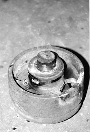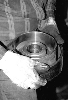 | 22. A plug is put inside the clutch in preparation for pouring. This plug is approximately 1/2" undersize. New babbitt material is poured. The pour is done in two parts because of the size of the ladle. The first pour is kept molten with a torch. |