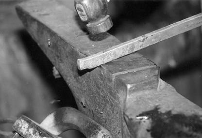 | 2.& 3. Put the barstock over the opposite edge of the anvil, extending it about 1 1/2" over the edge and forge it down, with half-face blows as well. |