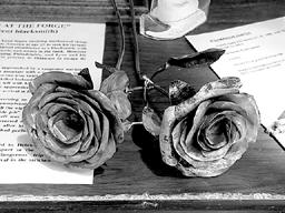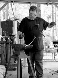 Note: Images and captions are at the bottom of this article. The Mississippi Forge Council's Annual Conference held May 25-27 at the Mississippi Agricultural and Forestry Museum in Jackson had mixed blessings from multiple perspectives. The upside was the very excellent and high-quality presentations, and just plain work that Peter Happny did at the forge for those in attendance. There are few demonstrators of the blacksmith's craft who can equal Peter Happny's presentation in Mississippi. His knowledge is wide and his craft is filled with extreme detail. That is what impressed me the most about his work-the detail he offered in relating the information. Peter exhibited a noticeable tendency to tell it all and to leave nothing to guess about. He has a very rare presence of mind while he works, knowing when gaps in his information were occurring during his demonstration. He would then quickly fill the gap. That kind of quality in a craft demonstration and teaching session is very rare and indicates that there is no latent intent to conceal motives or techniques in craft executions. How many times do we attend blacksmith presentations where we leave a demonstration forge with the sneaking feeling that we didn't get it all because the blacksmith didn't intend to reveal all of his money-earning secrets? Peter didn't leave us with that feeling. We got it all, from colors of hot metal, annealing, thicknesses, where to buy supplies, carbon content, alloying, how to market, and what to look out for from the metal and from the people with whom one deals on a project. It was something like receiving the "pure juice" of the craft from someone like Francis Whitaker or Frank Turley. There was a downside to the conference, however. We had only 31 one blacksmiths who signed up for the conference. It was a disappointment for all of us, but mostly for our Chapter officers, who have consistently and over many years presented annual conference programs that are second to none in the nation for a chapter event like this. In the past we have had Francis Whitaker, Jim Hrisoulas, George Dixon, Wendel Broussard, and now Peter Happny, who generously traveled to Mississippi to demonstrate at our conference. Peter Happny was self-taught in the early 1970s. He indicated that self-teaching helps to make a technique "stick" in one's memory, because the learning is original or generated from within. It is appropriate and sometimes easier to learn a technique from other blacksmiths, since this type of learning magnifies craft abilities with less sweat. However, Peter says that although the things that he learns from others are very important to him, they do not remain with him in memory as long or in as much detail as the things he teaches himself. The hundreds of memories of how to do things at an anvil go far back in time and can be conjured up when they are needed for project tasks. "You are going to forget things no matter how much you are self-taught, but it is fun to rediscover how you once did something," Peter explained. He listed four things that he uses to develop his projects. 1) Drawing-Put the project on paper and refer to the drawing when the project is being crafted. The final product may not look exactly like the envisioned concept in all of its details due to the way the material forges under the hammer, but it is important to stick to the original concept. A drawing will help to keep a project on track. 2) Forge Welding-This is a basic technique and any blacksmith worthy of his craft needs to have a firm grasp of this aspect of his work. Really, something like this goes without saying, but it is important to list it since it is so basic. He emphasized that it is important to upset both irons that are to be welded at the joint location before the weld is made in order to prepare a proper scarf for the weld. 3) Upsetting-This point was somewhat of a surprise to some of us, since we were expecting "bending" or "fullering" or "hammering" for Peter's third technique. Blacksmithing is the only craft that does upsetting and it is very important to completely master this aspect of forging. Potters who work with clay add material or squeeze it to size, but rarely mash it in on itself the way a blacksmith builds up the mass he is working with. Peter asked, "Did you know that the blacksmith is the only craftsman who can put a three-quarter inch hole in a three-quarter inch bar and still maintain the strength of the bar? Just think of it. What happens to a bar if a hole is simply drilled in it? Part of the cross-section area and material is diminished by the diameter of the drilled hole and thus the strength of the bar is diminished. But if the bar is upset, split and then drifted at the hole, the bar retains its strength." Some of us in the observing audience began to think about what he was saying and realized that he was emphasizing this technique much more than most of the demonstrators we had heard before. He demonstrated the classic technique of upsetting a bar by first forging a bevel on the end that is to be struck. This allows the force vector of the blow to more closely follow the central axis of the bar that is being upset. The beveled end allows a blow to fall on a much smaller area of the end that is almost right on top of the central axis of the bar. Peter uses a soft metal (aluminum) "gripper" placed in a vise to hold a bar that is to be upset. The softer metal conforms to the surface contours of the bar and allows a much firmer grip by the vise. Copper or bronze sheeting can be used for this purpose too. He likes to hit while the bar is held horizontally in the vise because the jaws of the vise, which push the soft metal "gripper" into the bar, has a much more secure hold due to the greater surface exposure to both the bar being held and to the jaws of the vise. The vise has contours that the softer metal can conform to for a more secure gripping action. However, he also likes hitting from the top