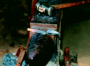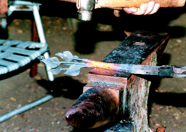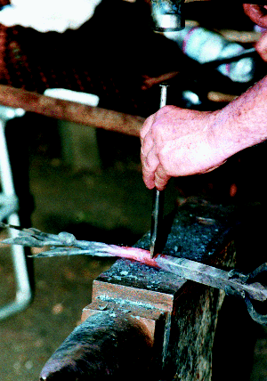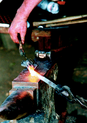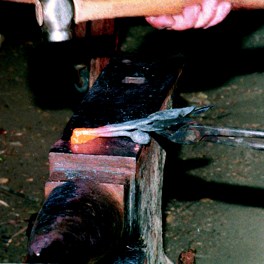 | 2. If I have a good clean fire, I don’t need to use flux. If I do use sand, I keep it off the face side of the weld. It’s mainly there to provide protection from the oxygen blast from the fire. The American fires with the center blast are particularly bad for that. If you’ve got a side blast, you can come away from your blast somewhat and protect it shield your work piece. | ![]() |