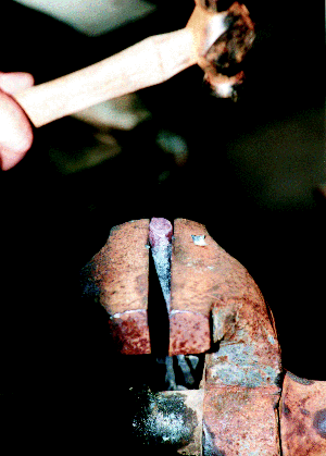 | 10. I have it in a vise using a ball-peen hammer so I can make the stem more authentic looking, as if it has broken off. |
