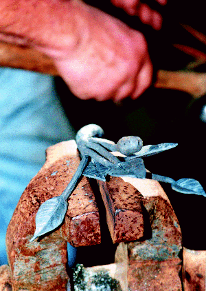 | 12. So I put it in the vise to try to achieve that objective. I twist the leaves with two pairs of tongs, again, to give it a more authentic look. Nature doesn’t have too many straight or square edges. |